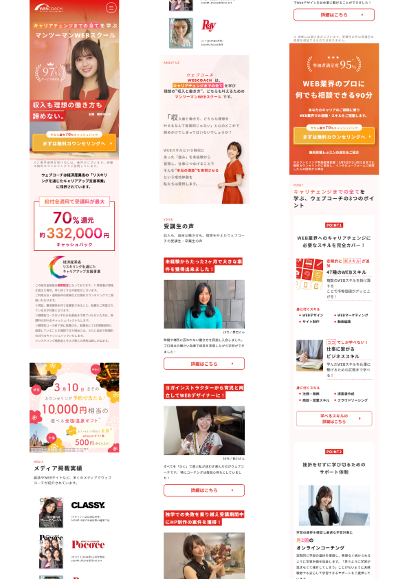 ホームページ制作 2025年9月18日 最終更新日時 : 2025年9月18日 webcoach-1014448 【製作時間】20時間【使用ソフト】Wordpress・Photoshop・illustrator・Figma【担当業務】デザイン・実装【意識した亊】どのデバイスでみても見やすくなるようにレスポンシブデザインを行いました。